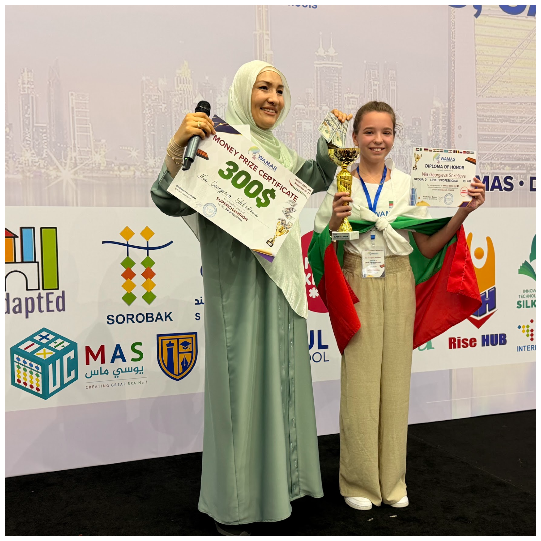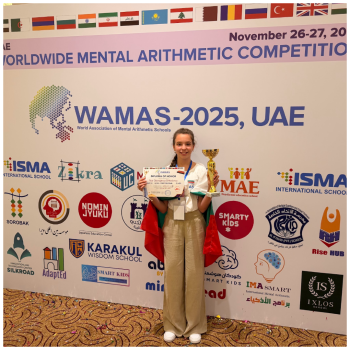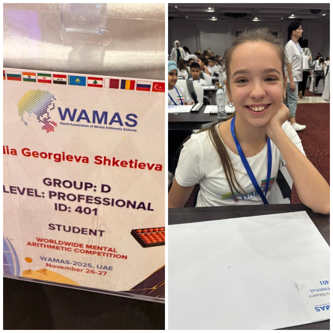 Седмокласничката Ния Шкетиева от ППМГ „Акад. Иван Ценов“ във Враца, постигна забележителен успех на Световното първенство по ментална аритметика WAMAS 2025. Състезанието се проведе в края на месец ноември в Дубай, Обединени Арабски Емирства. Представяйки България, Ния победи стотици участници от множество държави и спечели престижната титла супершампион WAMAS 2025.