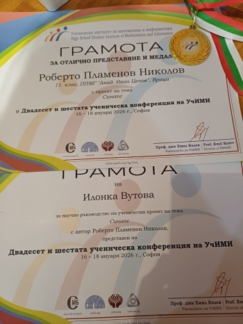Роберто Николов от XI г клас на Профилираната природо-математическа гимназия постигна значителен успех на XXVI Ученическа конференция по математика и информатика УчИМИ на БАН.