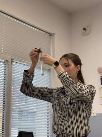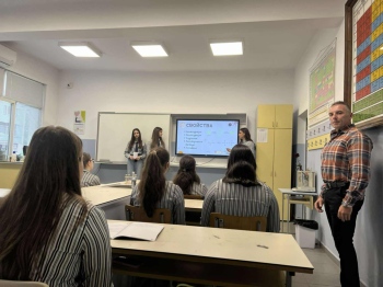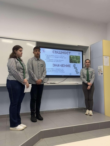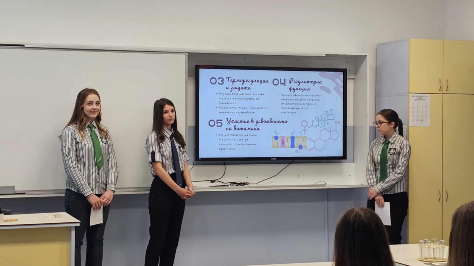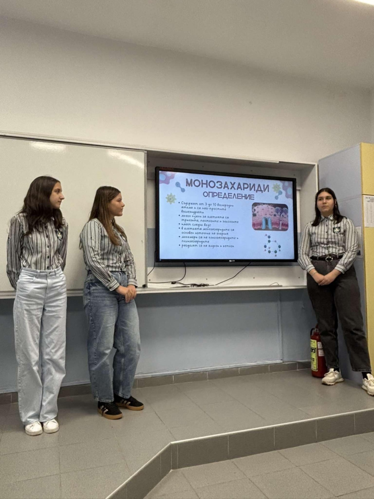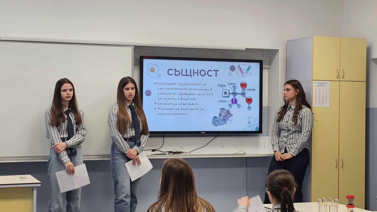 Бинарен урок на тема „Органични съединения - липидите, белтъците, въглехидратите и нуклеиновите киселини“ проведоха ученици от профилираната природо-математическа гимназия. Деветокласниците, с профил „Природни науки“, демонстрираха завидни познания и практически умения по биология и химия. Урокът, воден от г-жа Димитрина Милчева - старши учител по Химия и ООС и г-н Ивайло Лалков – старши учител по Биология и ЗО, имаше за цел да задълбочи разбирането на структурата, свойствата и биологичната роля на основните биомолекули.