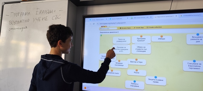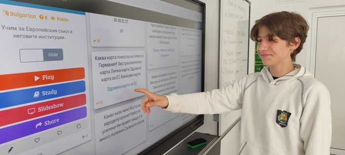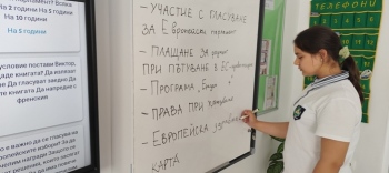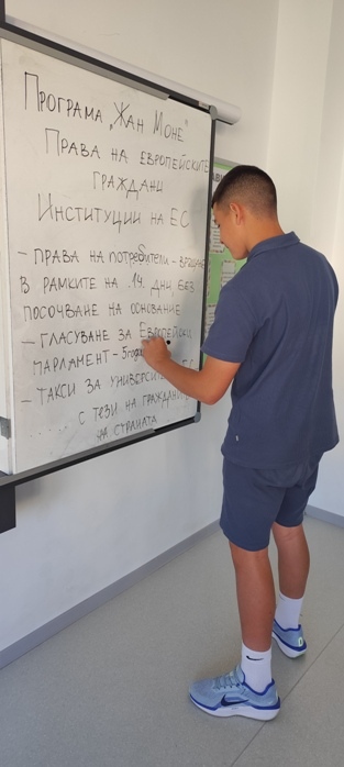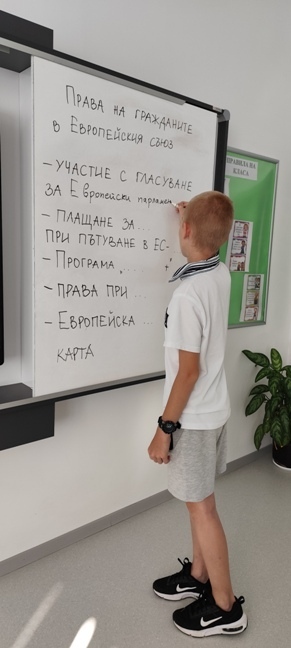 Обучението на учениците от V-VII клас премина под надслов „Европейски уроци“, с които те се информираха по важни за Европейския съюз въпроси — какво представлява организацията, как работи и какви облекчения осигурява на своите граждани. Обучението беше осъществено от г-жа Калина Николова, която представи пред учениците „Европейски диалози“, създадени от проф. Ингрид Шикова, преподавател в Катедра "Европеистика" на СУ "Св. Климент Охридски", със симулиране на казуси като пътуване в Шенгенското пространство, ползване на европейска здравна карта, роуминг услуги и др. Учениците изпълниха ролите в диалозите и решиха задачите в онлайн викторина и виртуална игра, създадени от г-жа Николова, с което приложиха наученото.