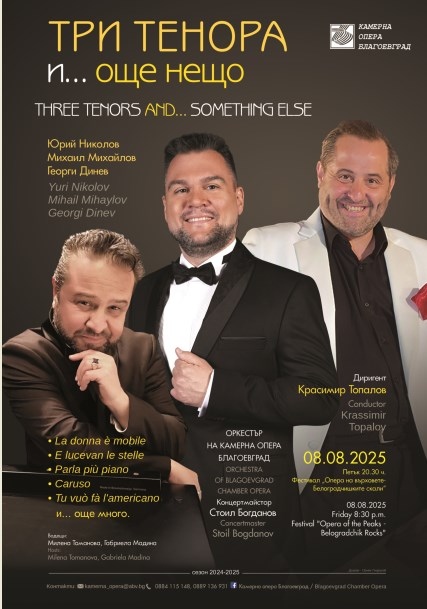Програмата на „Опера на върховете“ включва също и оперна гала с Тримата тенори - Юрий Николов (Камерна опера – Благоевград), Михаил Михайлов (Държавна опера – Русе и Камерна опера – Благоевград) и Георги Динев (Държавна опера – Стара Загора), които ще изпълнят подбрани арии заедно с оперната прима Мария Магдалена.