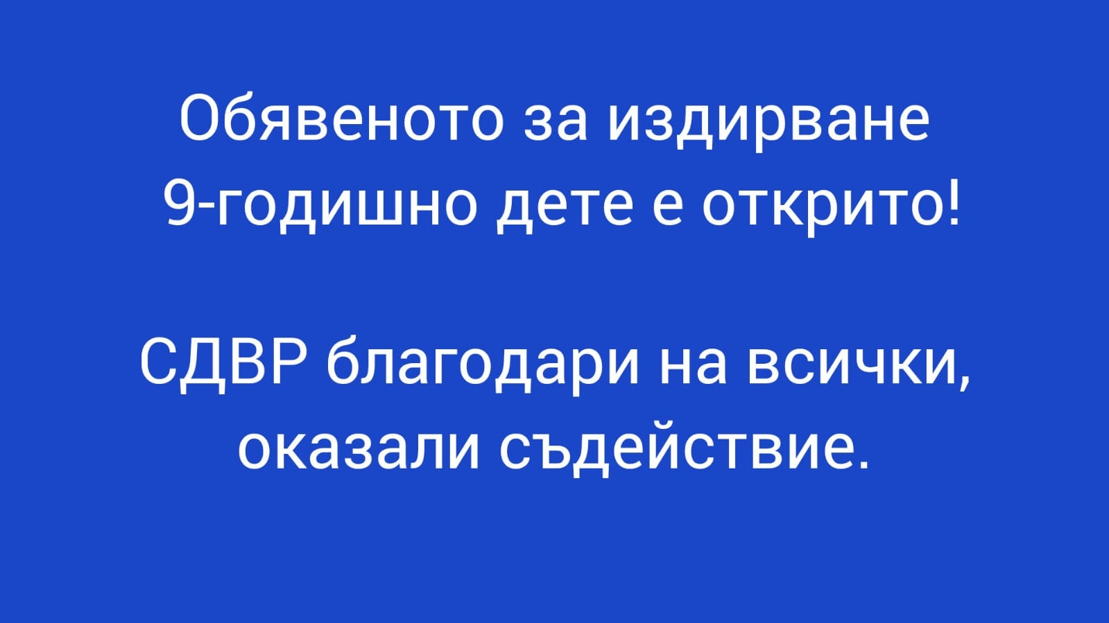 След щастливата развръзка по случая СДВР благодари на всички оказали съдействие на полицията и на притесненото семейство.