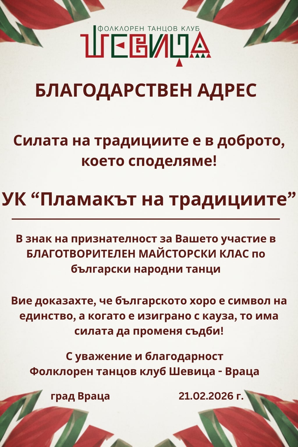 Учениците от клуб „Пламъкът на традициите“ при ППМГ „Акад. Иван Ценов“ - Враца сърдечно откликнаха на поканата за участие в благотворителна кауза, организирана от фолклорен танцов клуб „Шевица“. Те взеха активно участие в благотворителен майсторски клас по изработка на мартеници, които носят силни символични послания, свързани с българските традиции.