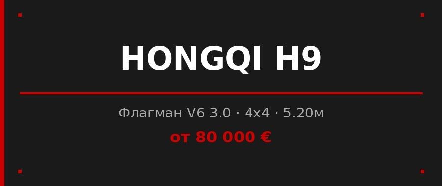 H9 е пълноразмерен луксозен седан, олицетворяващ способността на Hongqi да превежда разкош и престиж в съвременен автомобил. Три литра, V6, 4х4 задвижване, 5.14 м дължина. Директен конкурент на най-луксозните европейски марки.